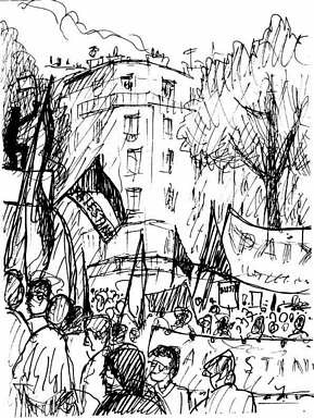 5) - La forte présence de la Palestine, avec les associations de défense du peuple palestinien et les chants de résistance, si beaux, si graves et si exaltants. Les nuées de femmes plus ou moins arabes ou juives, voilées ou pas, toujours si vives, si belles, si gaies et si rayonnantes, racontent beaucoup de l’espoir des peuples et donnent à la manifestation ses moments les plus forts. Dans cette cohue, nous retrouverons Samir Abdallah, le réalisateur du film « Ecrivains de frontières » que nous voulons projeter à Millau et St-Affrique les 18 et 19 juillet.